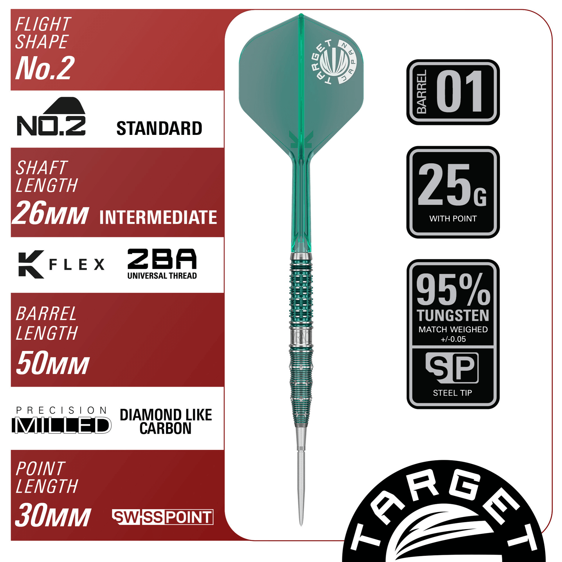 Die Darts sind außerdem mit dem beliebten Swiss Point System von Target ausgestattet. Swiss Point ist ein Spitzensystem mit dem die Steeldart Spitzen sekundenschnell ausgewechselt werden können. Mit Hilfe des mitgelieferten Swiss Point Tools wird die zu wechselnde Spitze einfach rausgedreht.